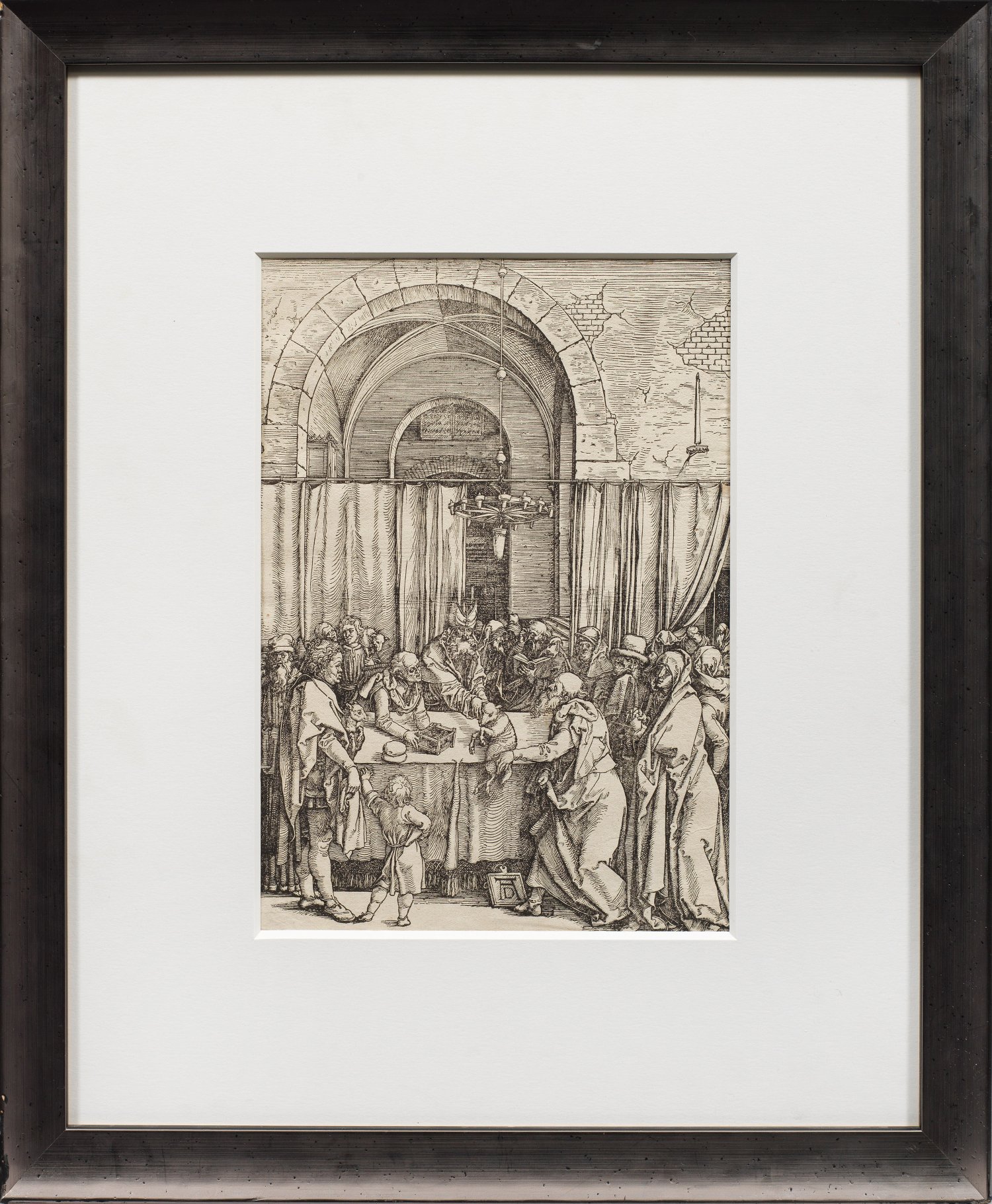 Holzschnitt/Papier, um 1600. Mittig unten im Stock auf einer Palette monogrammiert. Blatt 2 (von 20) aus Dürers Folge "Das Marienleben". Zustand g (nach Meder, Augabe ohne Text) mit Wasserzeichen Schild mit schrägem Balken (Meder 246). Hollstein 189, Bartsch 77, Meder 189 g, Schoch/Mende/Scherbaum 167. Auf die Einfassungslinie beschnitten. Ger. rest./hinterlegt. Blatt 29,8 cm x 21,1 cm. Rahmen.