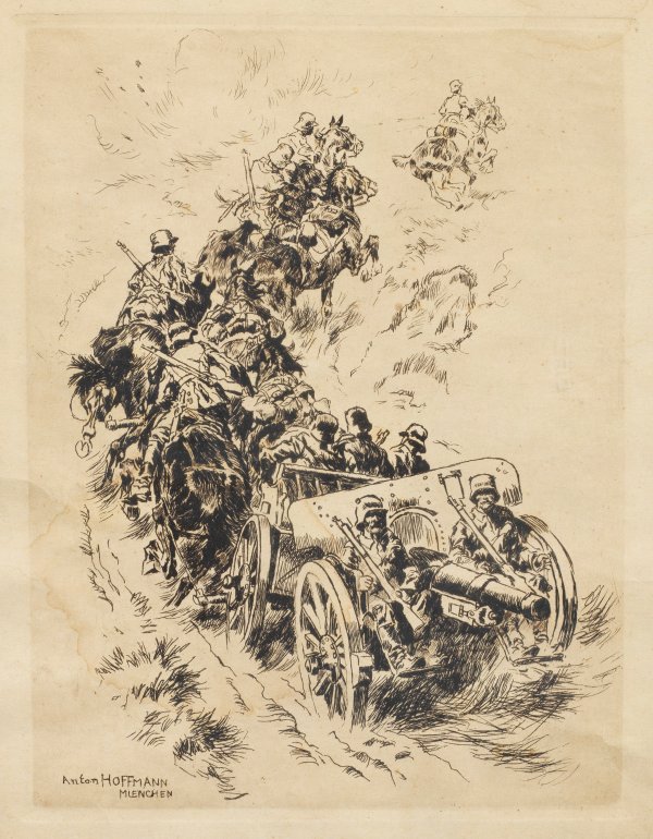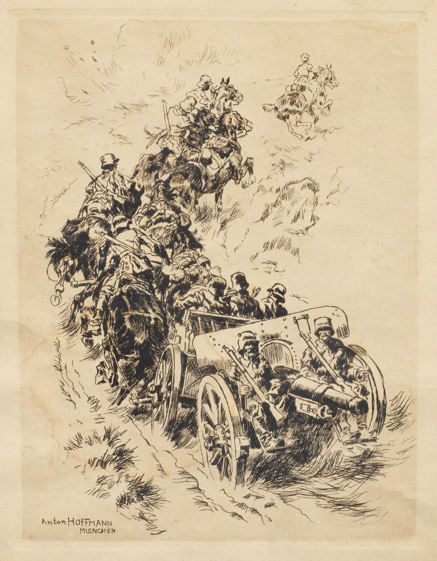Radierung/Papier. In der Platte sign. und mit Ortsangabe München. Nachgedunkelt, wasserfleckig. Blatt 45,3 cm x 30 cm. Platte 29,2 cm x 22,8 cm. Rahmen.