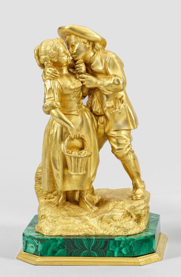 Bronze, vergoldet. Malachit-Sockel mit korrespondierender Standkante aus vergoldeter Bronze. Vollplastische Darstellung eines auf einer fein ziselierten Naturplinthe stehenden Jünglings beim Kuss eines Bauernmädchens mit Früchtekorb. Ges.-H. 24,3 cm.