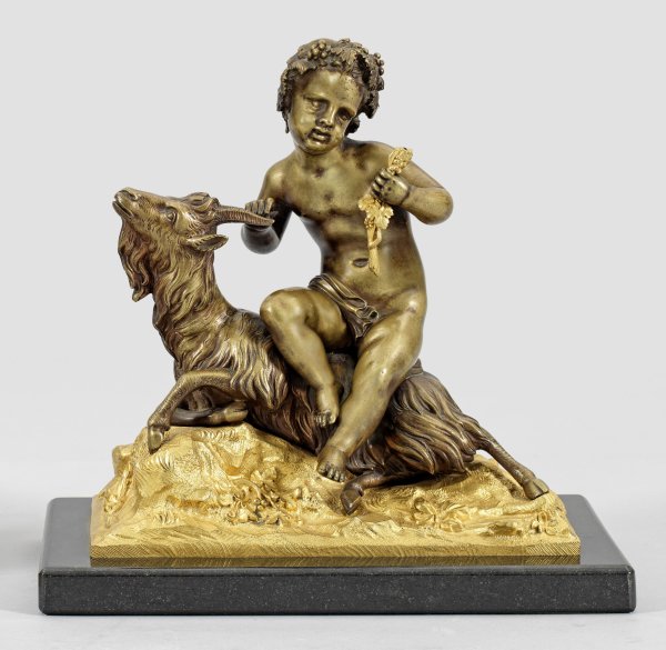 Bronze, braun patiniert und vergoldet; moderner Diabassockel erg.; Vollplastische, im Detail fein ziselierte Gruppe. Weinrebe in der linken Hand ger. besch.; Ges.-H. 25,5 cm.