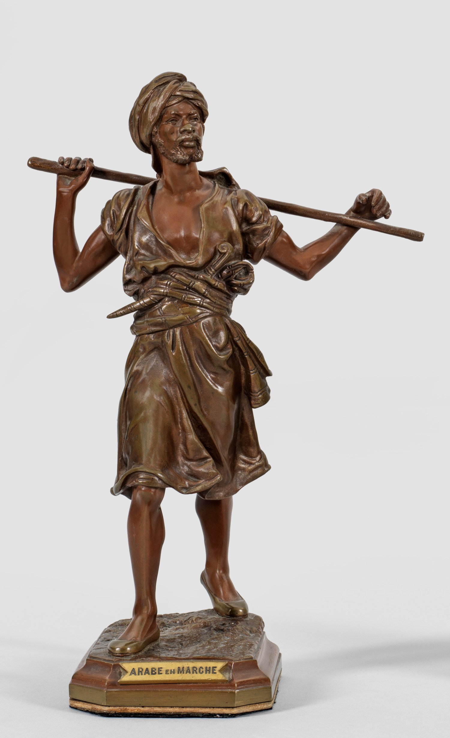 Bronze, hellbraun und rotbraun patiniert. Sign., an der Plinthe betitelt; Stempel bzw. Marke "BRONZE GARANTI AU TITRE (/) /PARIS". Vollplastisch, sehr lebendig und realistisch geschilderter Nordafrikaner mit Turban, auf seinen Schultern einen Stock tragend. Die im Detail sehr fein ausgeführte, realistische Statuette mit lebendiger, ausdrucksvoller Wiedergabe gehört zu den bekanntesten Plastiken des Bildhauers, der 1870 im Salon debütierte. Ges.-H. 33,5 cm.