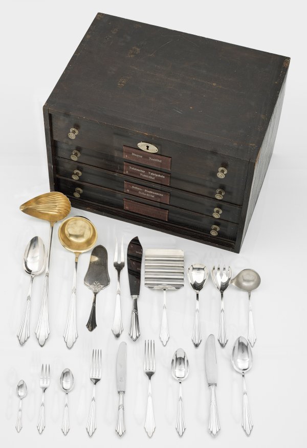 An extremly comprehensive about 630-pieces German plated remaining cutlery. With two wooden cutlery boxes. Marked 90, maker´s mark.