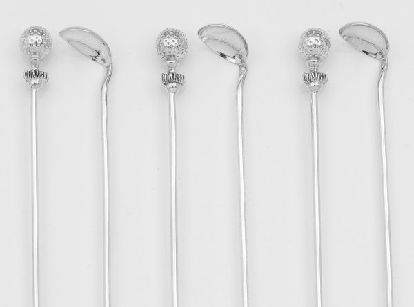 Sterlingsilber. Ovale, gemuldete kleine Laffe im nahezu rechten Winkel übergehend in schmalen, langen Stiel. Als Griff ein vollplastischer Golfball auf einem Tee über stilisiertem Grün liegend. Gest. 925, Herstellerzeichen. Gew. zus. ca. 255 g. L. 22,5 cm.