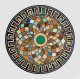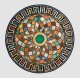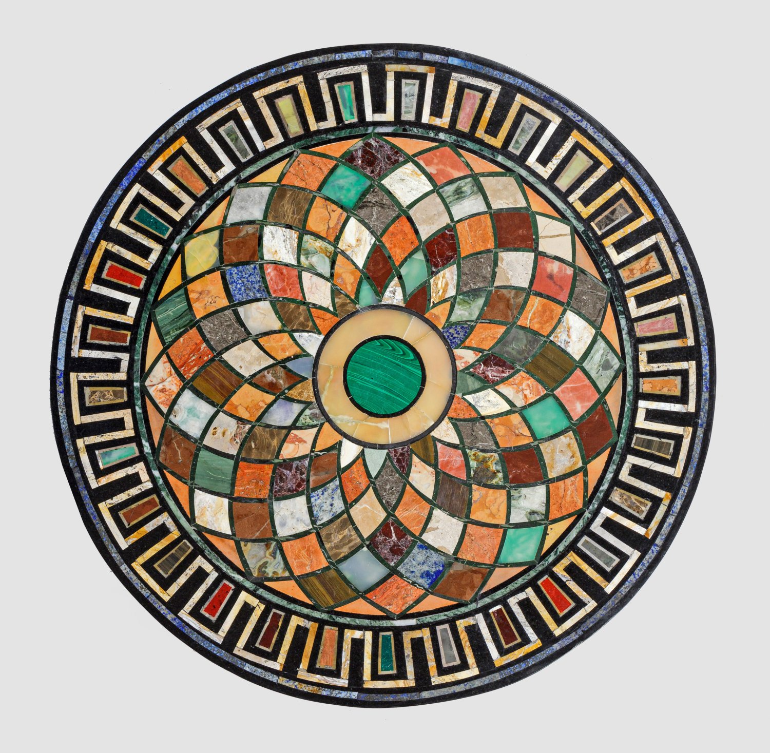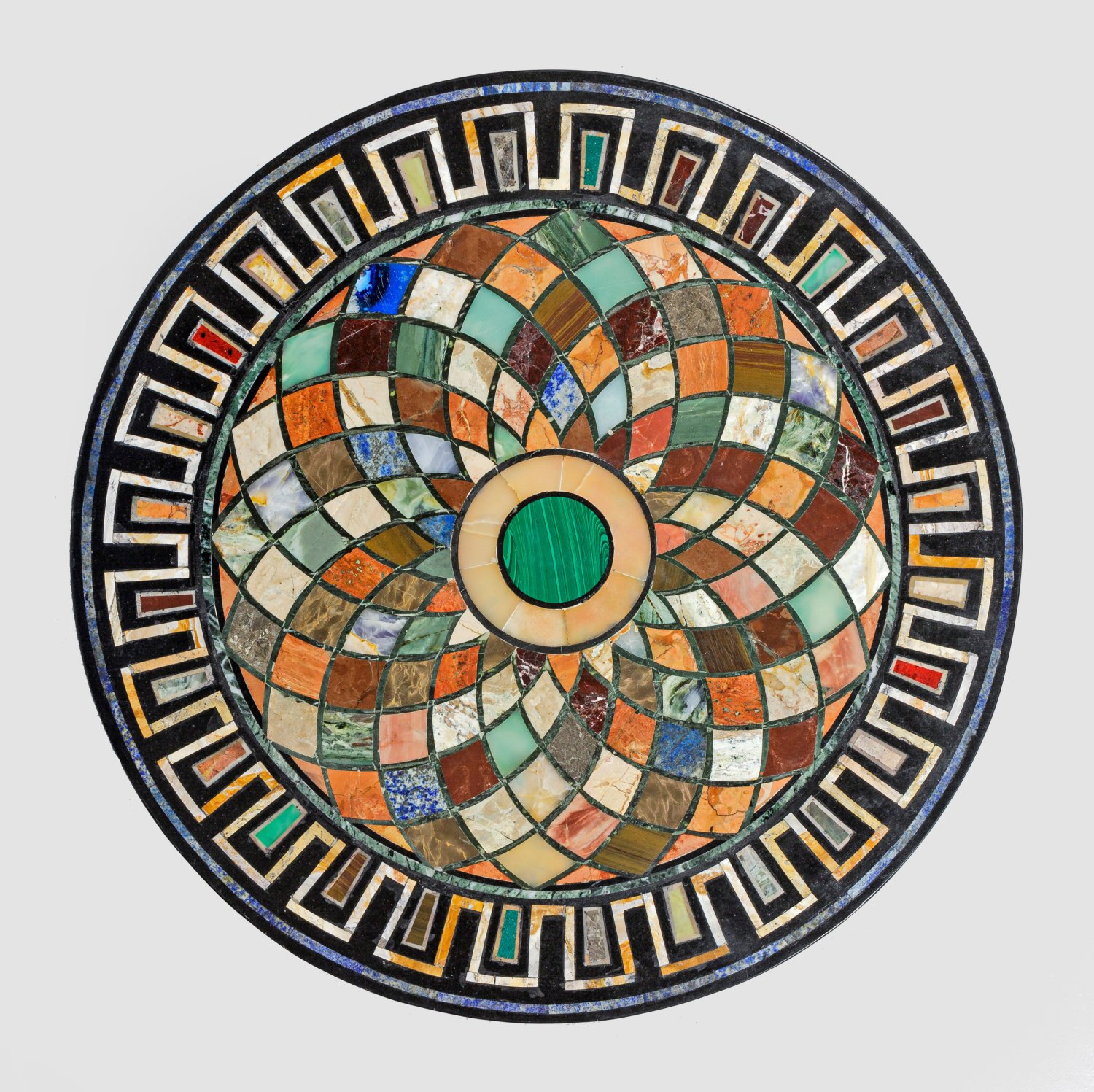 Anthrazitfarbener Marmor mit Einlagen aus Lapislazuli, Malachit sowie unterschiedlichen Marmorsorten in Gelb-, Rot-, Braun- und Grüntönen. Runde Platte. Auf schwarzem Fond zentrales Tondo, umgeben von flächendeckenden blütenähnlich angeordneten Reserven. Umlaufende Bordüre aus stilisiertem Mäander. D. 60 cm.