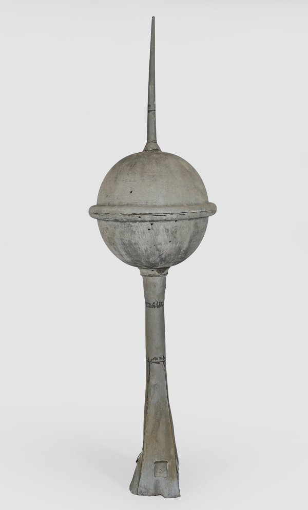 Blech, grau lackiert. Sich konisch verjüngender Schaft als Träger für großes Kugelelement. Oberhalb gestreckte Spitze. H. 188 cm.