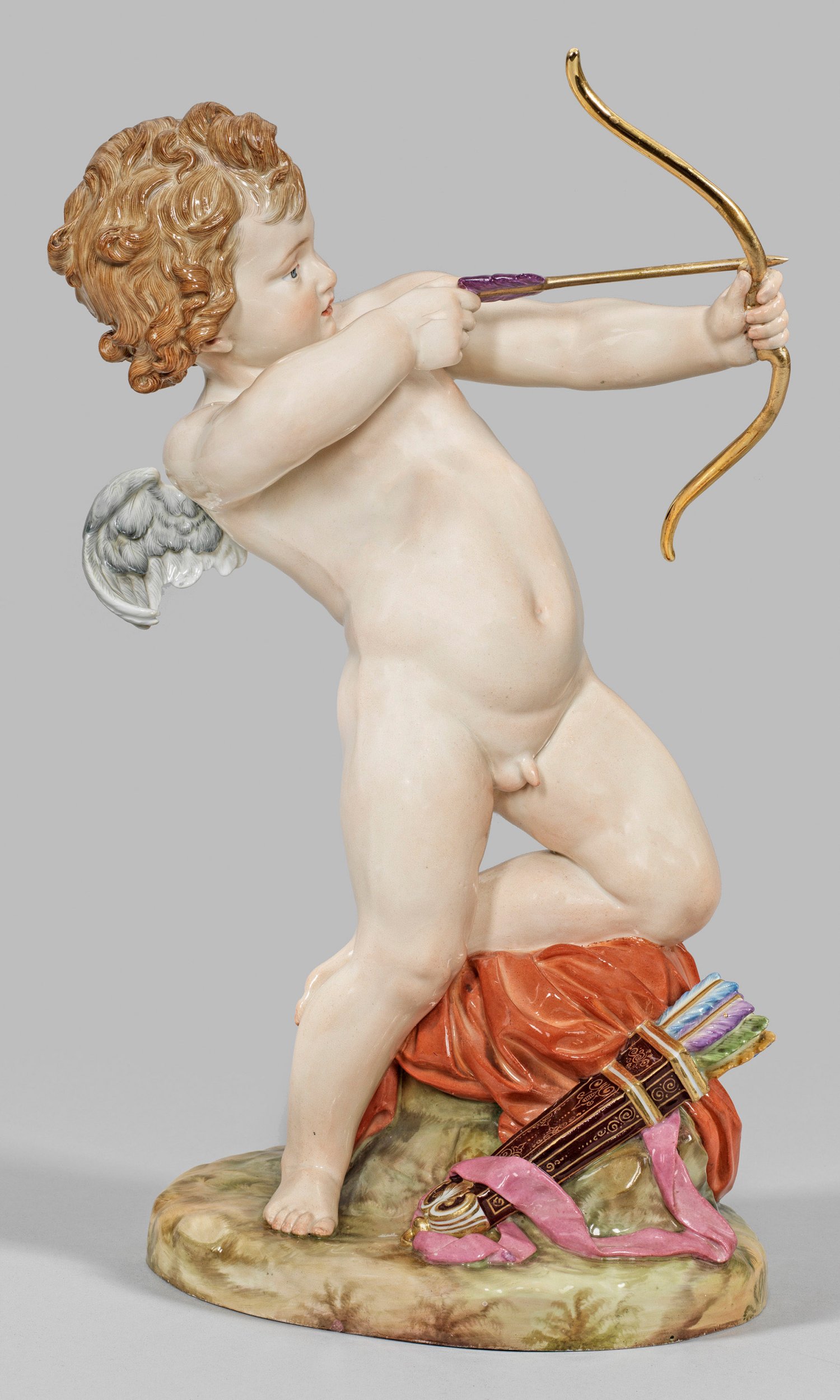 Über ovalem, naturalistisch gestaltetem Sockel stehender, unbekleideter Amor, den linken Unterschenkel auf einen Felsen mit rotem Tuch stützend. Den Oberkörper nach hinten neigend und mit Bogen einen Liebespfeil abschießend. Zu den Füßen liegender Köcher mit weiteren Pfeilen. Polychrome Malerei mit Goldstaffage. Entw. Johann Christian Hirt, 1881. Modell-Nr. M 159. Rest.; Schwertermarke. H. 43 cm.