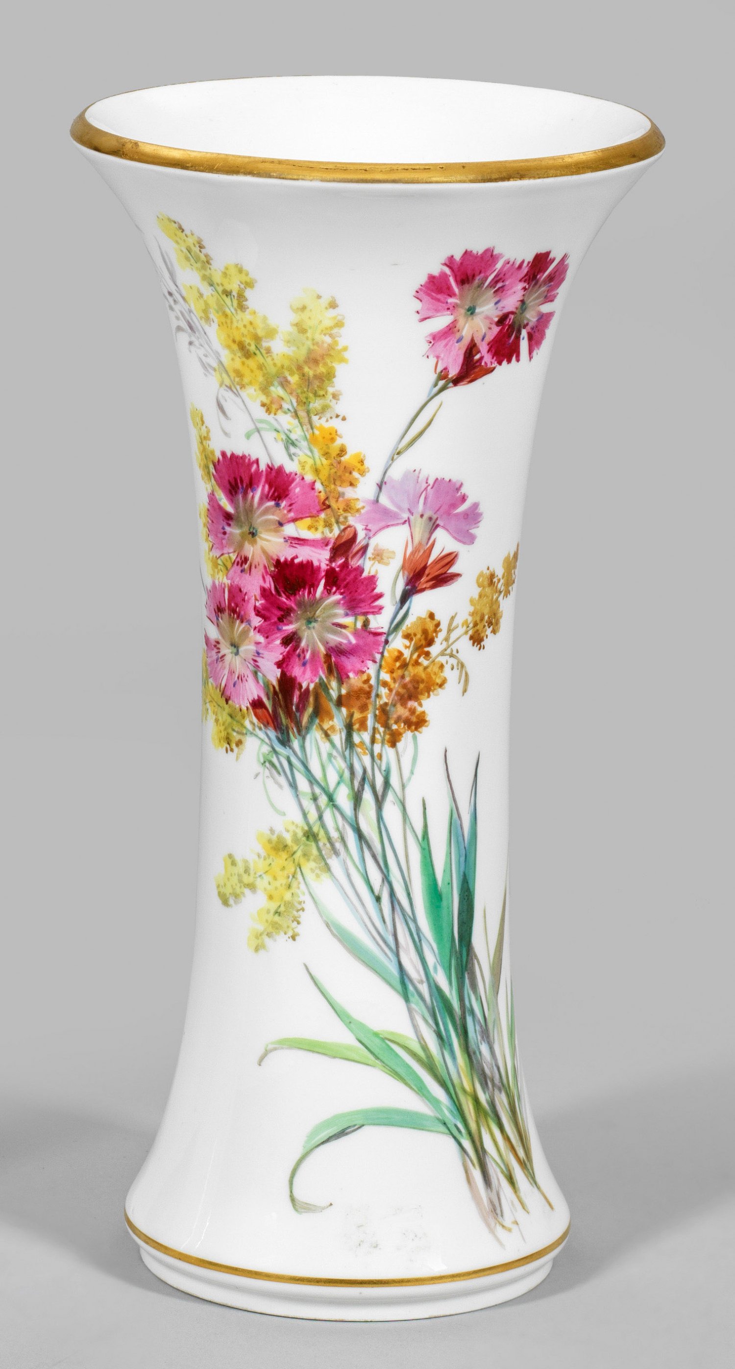 Flötenförmiger Korpus mit ausschwingendem Rand auf abgesetztem Standring. Auf der Schauseite farbenprächtiges Blumengebinde aus Nelken und Goldrute in feiner polychromer Malerei. Goldrand. Schwertermarke. H. 25 cm.