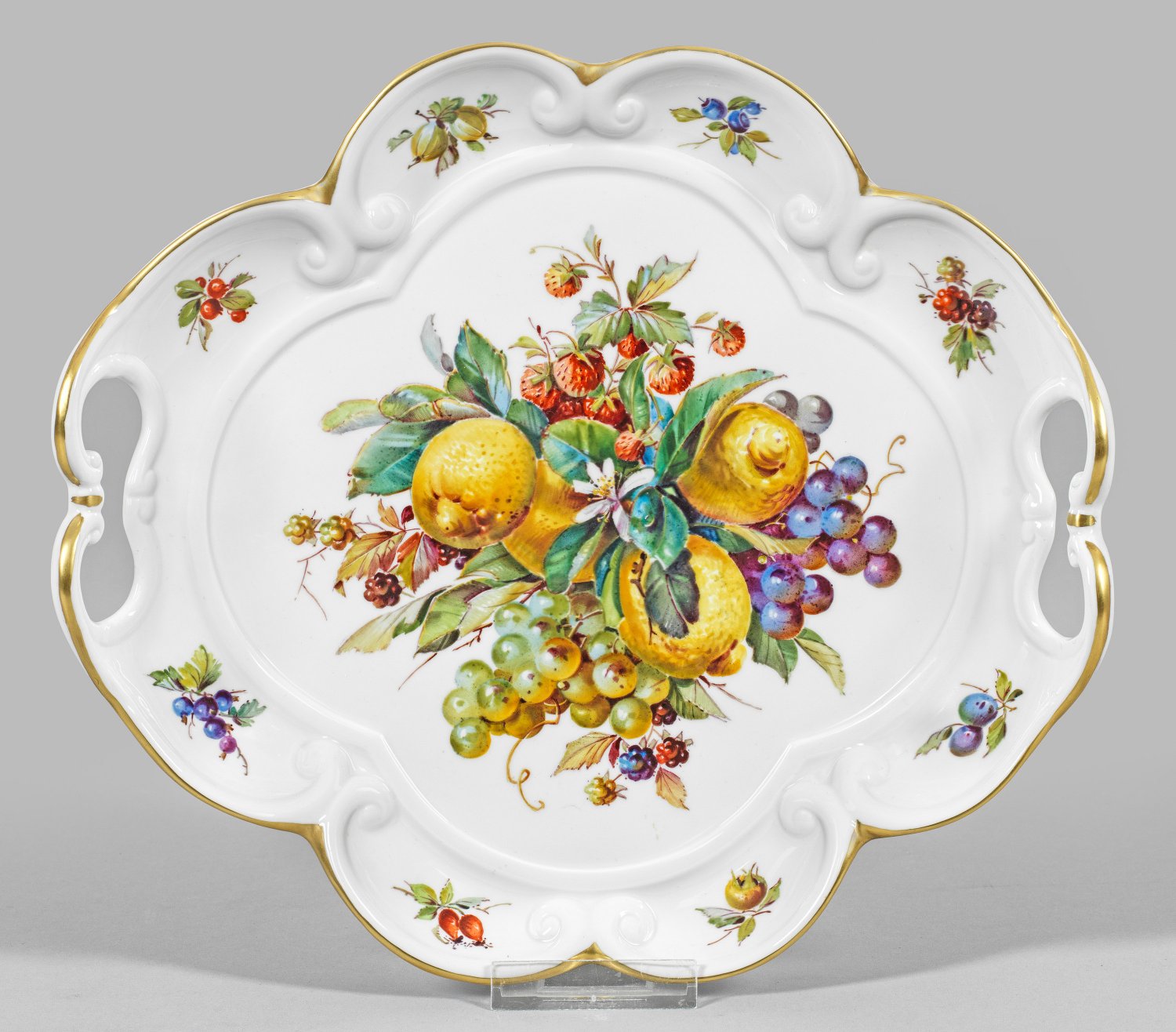 Passig geschweifte, flach gemuldete Form mit volutenförmig reliefiertem Rand. Seitlich durchbrochen gearbeitete Handhaben. Im Spiegel, profilierte Vierpassreserve gerahmtes, farbenprächtiges Arrangement auf der Fahne verschiedene Früchtezweige in feiner, polychromer Malerei. Goldrand. Schwertermarke. 30 cm x 27 cm.