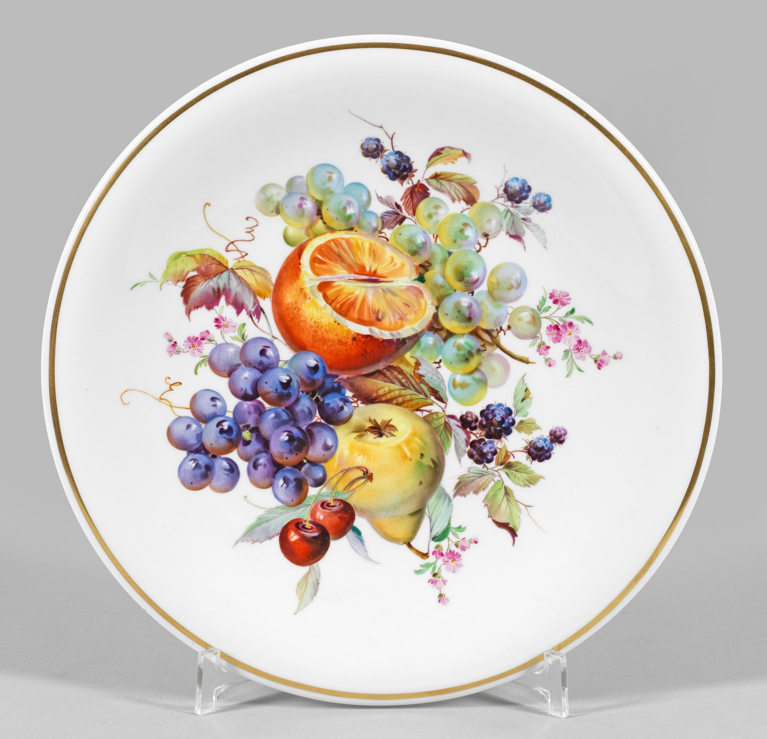Runde, flach gemuldete Form. Im Spiegel großflächig angelegtes, farbenfrohes Früchtearrangement aus Trauben, Birne, Orange, Kirschen und Brombeeren in weicher, impressionistisch anmutender Malerei. Goldrand. Rücks. Wandaufhängung. Schwertermarke. D. 31,5 cm.