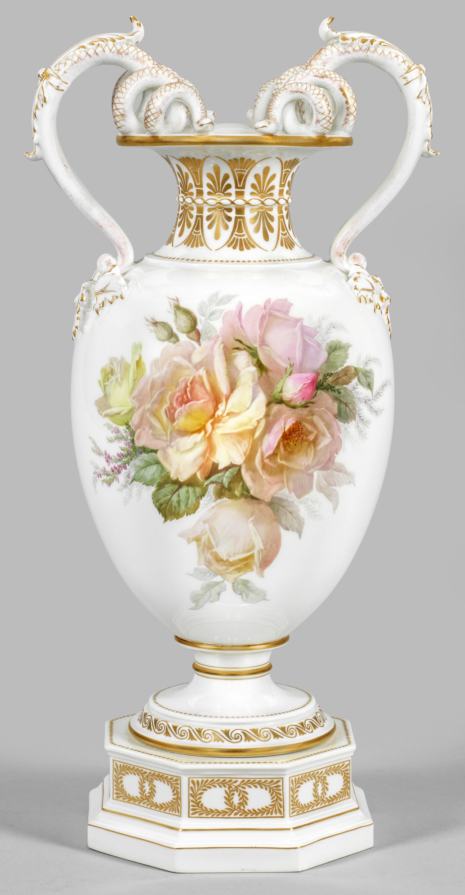 sog. Urbino-Vase. Über oktogonalem, getrepptem Postament mit rundem Fuß, ovoider Korpus mit gerundeter Schulter, in eingezogenen Hals und weit ausschwingenden Rand übergehend. Seitlich, über aufgelegtem Blattreliefansatz geschweift aufsteigende Handhaben in Gestalt eines, sich spiralförmig windenden Schlangenpaares. Beidseitig der Wandung großflächiges Arrangement aus Rosen in pastelltoniger Weichmalerei. Umlaufend stilisierter Golddekor aus Palmettenfries, Wellenband, Perlschnur und Rankenornamentik sowie Goldstaffage. Form-Entw. Julius Wilhelm Mantel, 1855. Zepter-, Malerei- und Gedächtnismarke (Eisernes Kreuz). H. 47 cm.