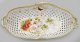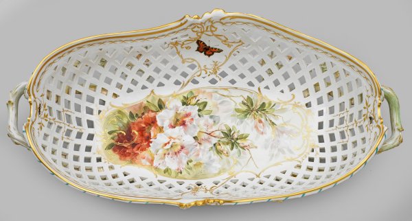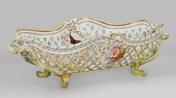 Länglich-ovale, tief gemuldete Schale, volutenförmig geschweifter, profilierter Rand mit Flechtband in Ajour. Die astförmig ausgeformten Füße, in geschwungen aufsteigende, gebogte Asthenkel übergehend. Korbgeflechtartig durchbrochene Wandung mit plastisch aufgelegten Blumenranken, darin beidseitig ausgesparte Rocaillekartuschen mit farbenkräftigem Bukett aus Chrysanthemen bzw. Wildrosen. Im Spiegel und auf der Innenwandung das, von feinlinigen Goldranken umzogene Arrangement aus Alpenrosen bzw. farbenprächtigen Schmetterlinge und Insekten in pastelltoniger Weichmalerei. Mintgrüne und zartgelbe bis apricotfarbene Staffierung mit blauen Akzenten. Modell-Nr. 5720. Jahreszeichen. Zepter- und Malereimarke. H. 22 cm. L. 70 cm.