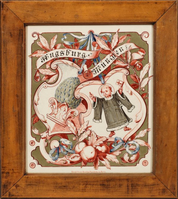 Rechteckige Bildplatte. An blauen Bändern, die sich überlappenden Stadtwappen von Augsburg und München, dargestellt mit Pinienzapfen (bzw. Zirbelnuss) auf Kapitell und Münchner Kindl, umzogen von Lorbeerzweigen und Früchten in polychromer Malerei auf hellem Grund. Goldakzentuierungen. Am unteren Rand bez. "Königl. Preuss. Porzellan Manufactur zu Berlin". Buchenholz-Rahmen 54,5 cm x 49 cm. Bildmaß 40 cm x 35 cm.