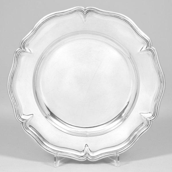 Silber. In klassischer Chippendaleform. Glatter, gemuldeter Spiegel, übergehend in gering ansteigende, breite Fahne mit blütenförmig geschweiftem, mehrfach profiliertem Rand. Gest., Beschauzeichen, Herstellerzeichen "J.C.K." sowie Doppeladler für Hoflieferanten. Gew. ca. 955 g. D. 33 cm.