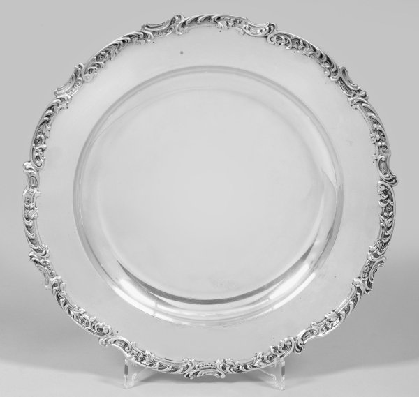 Silber. Runde Form. Elegant glatter, gemuldeter Spiegel, übergehend in gerade, breite Fahne. Mehrfach profilierter, erhabener Rand mit reliefplastisch gestalteter, umlaufender Bordüre aus Akanthusblättern, Muschelwerk und Rocaillen. Gest. 800, Herstellerzeichen. Gew. ca. 1135 g. D. 35 cm.