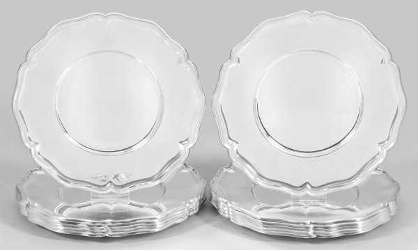 Silber. Gering vertiefter, glatter Spiegel, übergehend in breite Fahne. Blütenförmig geschweifter, mehrfach profilierter Rand. Gest. 800, Herstellerzeichen. Gew. zus. ca. 7095 g. D. 30 cm.