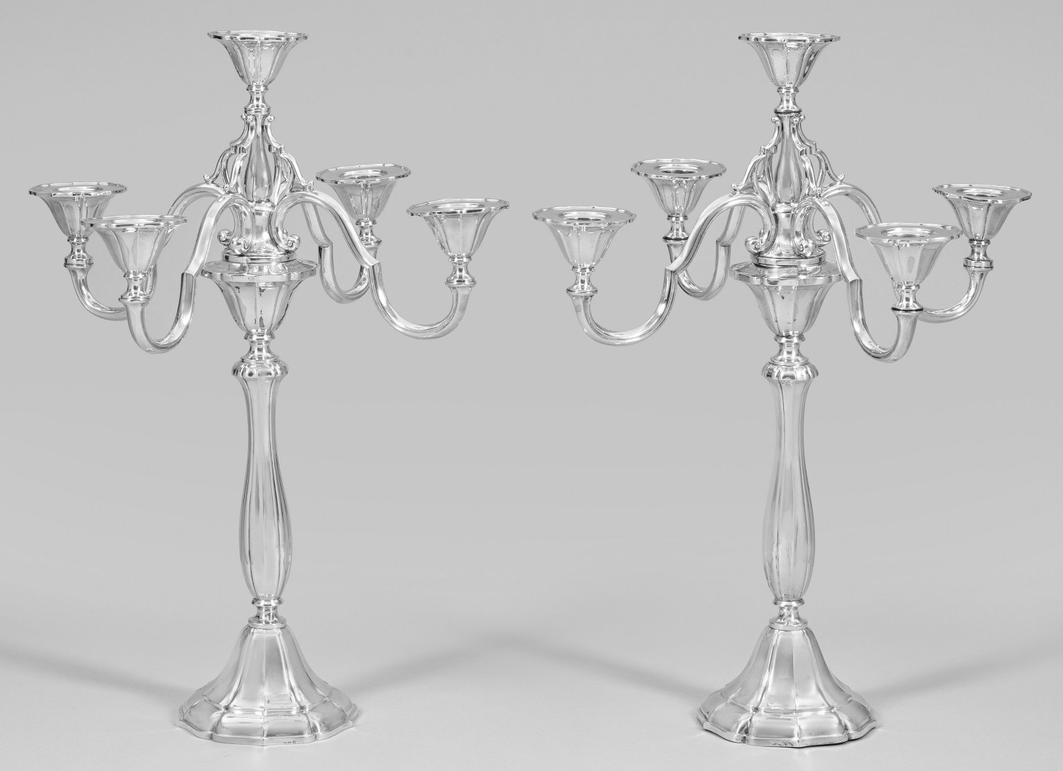 als ein Direktoren-Geschenk des Aufsichtsrates und Vorstandes des Bankvereins für Schleswig-Holstein. Silber. 1- bzw. 5-flg.; Nahezu runder, blütenförmig geschweifter, profilierter Stand, beschwert. Hoher Balusterschaft mit abgesetzter Schulter und sich stark weitender Tülle. Darin herausnehmbarer, durchbrochen gearbeiteter Einsatz mit vier geschwungenen, schmalen Leuchterarmen sowie zentral aufsteigender korrespondierender Tülle. Gerade Traufschalen. Leuchter umlaufend durch passig geschweifte, vertikale Züge gegliedert. Auf unterster Traufschale gravierte Widmungsinschrift und dat.; Gest. 800, Herstellerzeichen. Gew. zus. ca. 2845 g. H. 49 cm.