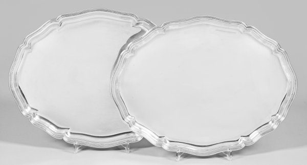 Silber. Ovale Form. Glatter, gering gemuldeter Spiegel, übergehend in blütenförmig geschweiften, mehrfach profilierten Rand. Eine mit passiger Glasplatte. Gest. 830, 835, Herstellerzeichen. Gew. zus. ca. 2185 g. 45,3 cm x 35,2 cm.