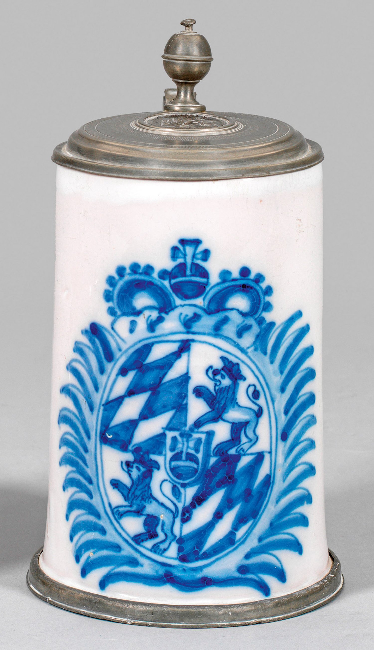 A Bavarian pewter-mounted blue and white faience tankard with the coat of arms of the Electorate of Bavaria. Minor glaze chips to handle and rim.