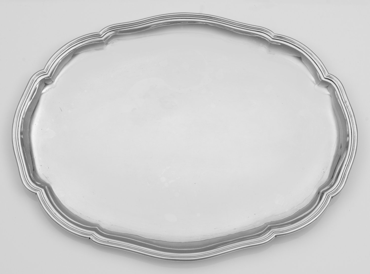 Silber. Ovale Form. Glatter, gering gemuldeter Spiegel, übergehend in blütenförmig geschweiften, mehrfach profilierten Rand. Gest. 800, Herstellerzeichen. Gew. ca. 805 g. 42,5 cm x 32 cm.
