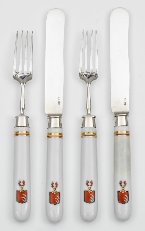in originalem, metallbeschlagenem und mit schwarzem, geprägtem Leder bezogenem Holzkasten. Silber, Porzellan. 36-tlg.; 18 Speisemesser, 18 -gabeln. Vierzinkig mit gering konischem, am Ende gerundetem Porzellangriff. Der Ansatz umzogen von Zierlinien. Auf der Unterseite das Wappen der Grafen Kinsky mit auffälliger Helmzier in Gold und orange- bzw. graufarbener Überglasurmalerei. Schlüssel fehlt. Gest., Beschauzeichen, Herstellerzeichen. Kasten: H. 8 cm. 36,5 cm x 25,5 cm.