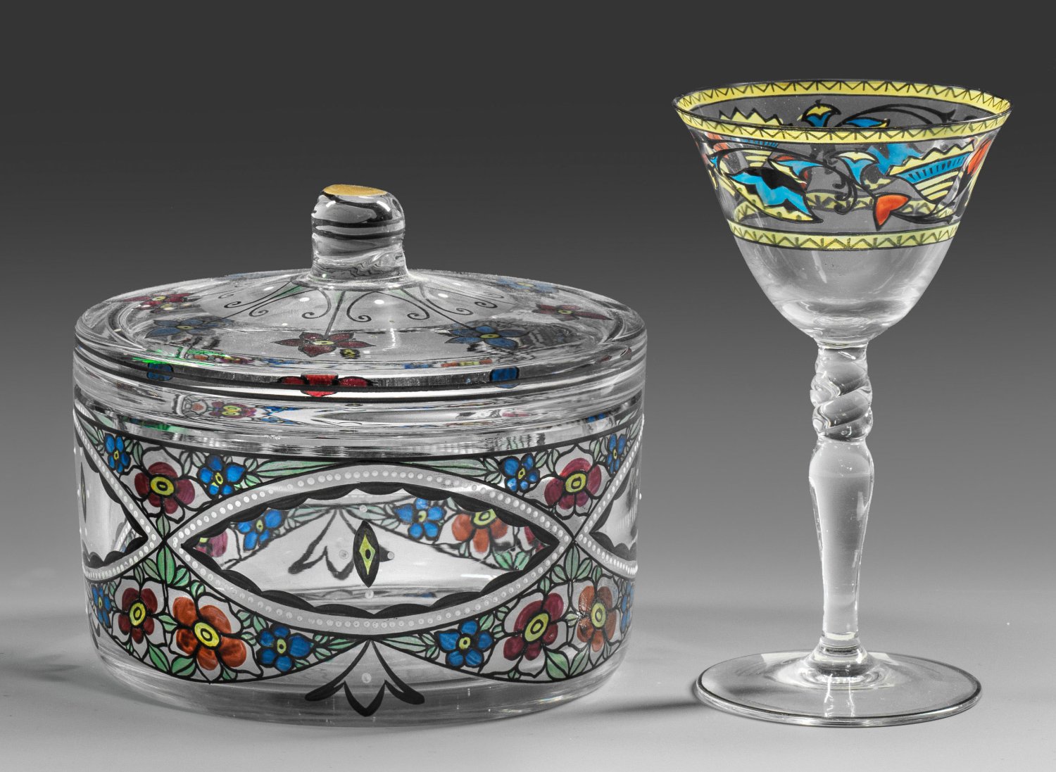 Zylindrische, niedrige Dose mit leicht ansteigendem Deckel, das Kelchglas mit oberhalb spiralig gedrehtem Schaft und glockenförmiger Kuppa. Farbloses Glas, stilisierte florale Dekore in polychromer Emailmalerei, Gold und Mattsalz. H. 13,7 cm, D. 13,5 cm (Dose).