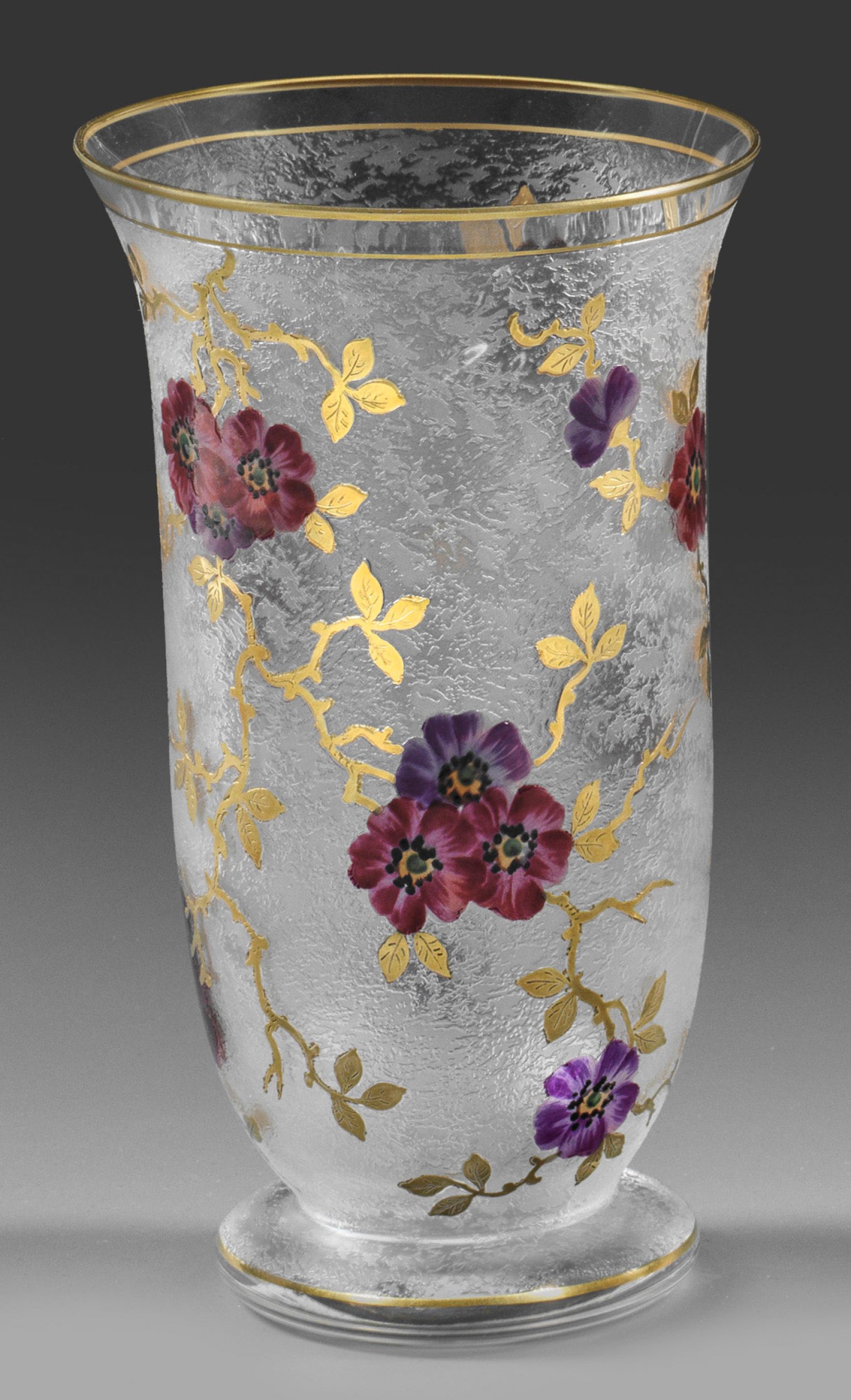 Hohe Glockenform auf leicht ausgestelltem Fuß. Farbloses, dünnwandiges Glas. Rosenzweigdekor auf Eisglasgrund, geätzt und vergoldet sowie kombiniert mit farbiger Emailmalerei. H. 17,2 cm.
