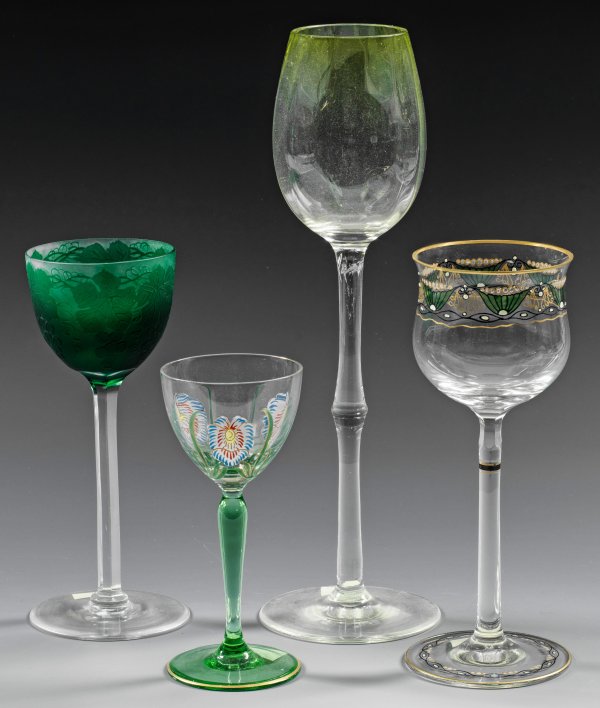 Farbloses Glas, teilw. grünes Glas, grün überfangen bzw. annagrün verlaufend, partiell geschliffen. Bestehend aus hohem Glas mit längsoptischer Kuppa, Entw. wohl Koloman Moser oder Schule für Meyr's Neffe; einem Südweinglas mit floralem Emaildekor, wohl Meyr's Neffe; einem Weißweinglas mit stilisiertem Dekor in Email-, Gold- und Schwarzlotmalerei, wohl Josephinenhütte; einem Weißweinglas mit Ätzdekor. H. 14,8 cm-30 cm.