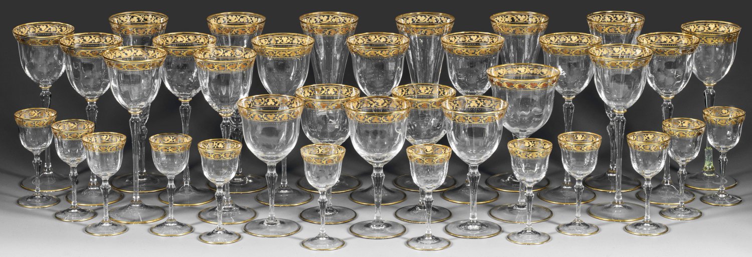 35-tlg.; Farbloses Glas. Flacher Scheibennodus, Keulenschaft, längsoptisch geblasene Kuppa in unterschiedlich gestreckter Glockenform. Am Lippenrand eine Bordüre mit Rocaillen und einer Kleeblattranke in Goldmalerei, teilw. in Reliefgoldmalerei, der Fuß goldgerändert. Ein Fuß erg.; Serie Elisabeth, Form-Entw. Arthur Gerlach, Dekor-Entw. Alexander Pfohl. Bestehend aus 5 Sektflöten (H. 21 cm), 5 Südwein- bzw. Sherrygläsern (H. 15 cm), 1 Weinglas (H. 17.2 cm), 12 hohen Weingläsern (H. 21,2 cm), 12 Likörgläsern (H. 11 cm).