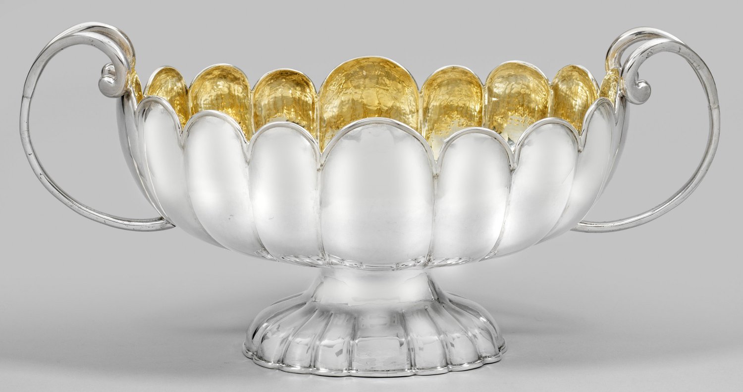 Sterlingsilber. Ovaler, aufgewölbter Stand, übergehend in stark eingezogenen, kurzen Schaft und weit ausschwingender, gebauchter Schale. Stand und Korpus umlaufend durch breite, gebuckelte Godronen verziert und in korrespondierend, passig geschweiftem Rand endend. Seitlich zwei, zum Rand hin zweigeteilte und volutierte Ohrenhenkel. Innen mit feinem Hammerschlagdekor verziert und vergoldet. Gest. 925, Herstellerzeichen "CK" sowie niederländische Repunzierung seit 1953. Gew. ca. 2870 g. H. 27 cm. 56 cm x 27,5 cm.