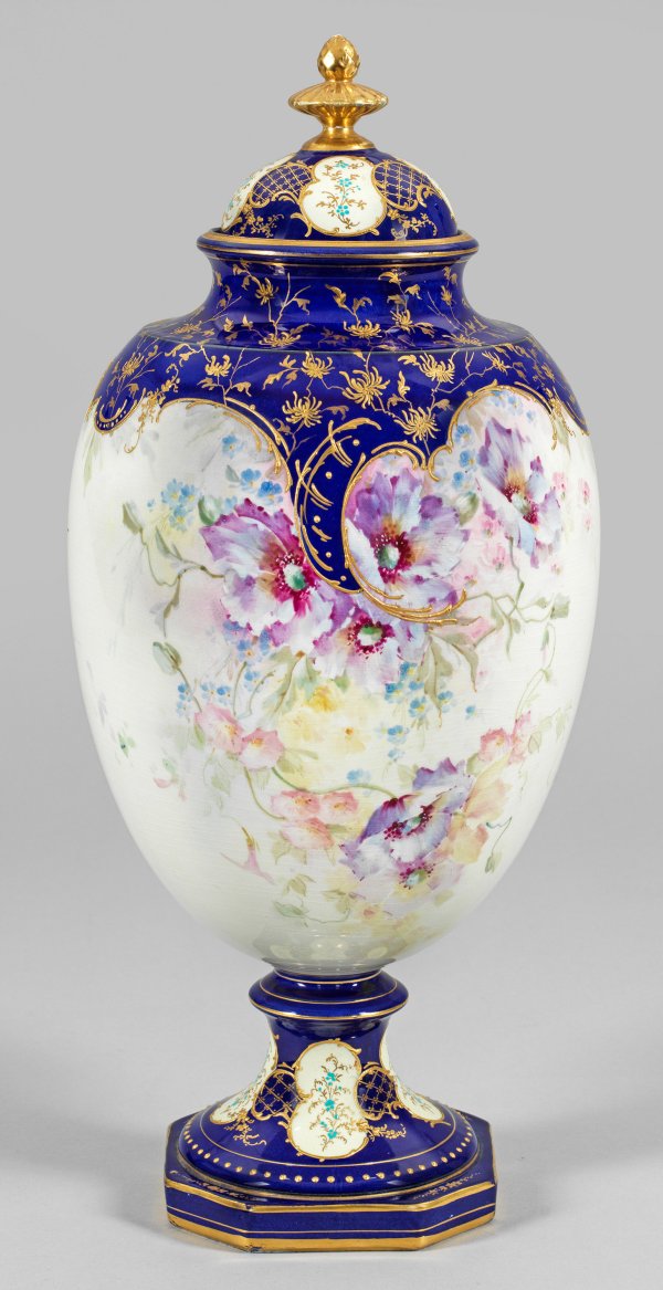 Steingut. Balusterform mit ovoidem Korpus auf achteckigem Fuß, der gewölbte Deckel mit Rosetten- und Pinienknauf. Polychromer Dekor in Unterglasurmalerei und Reliefgoldmalerei im Stil der Weichmalerei von KPM Berlin, partiell königsblauer Fond. Modell-Nr. 1310. Deckelfalz ger. best.; Manufakturmarken sowie gemalte Nummern 1236a, D. 4601 und 284. H. 51 cm.
