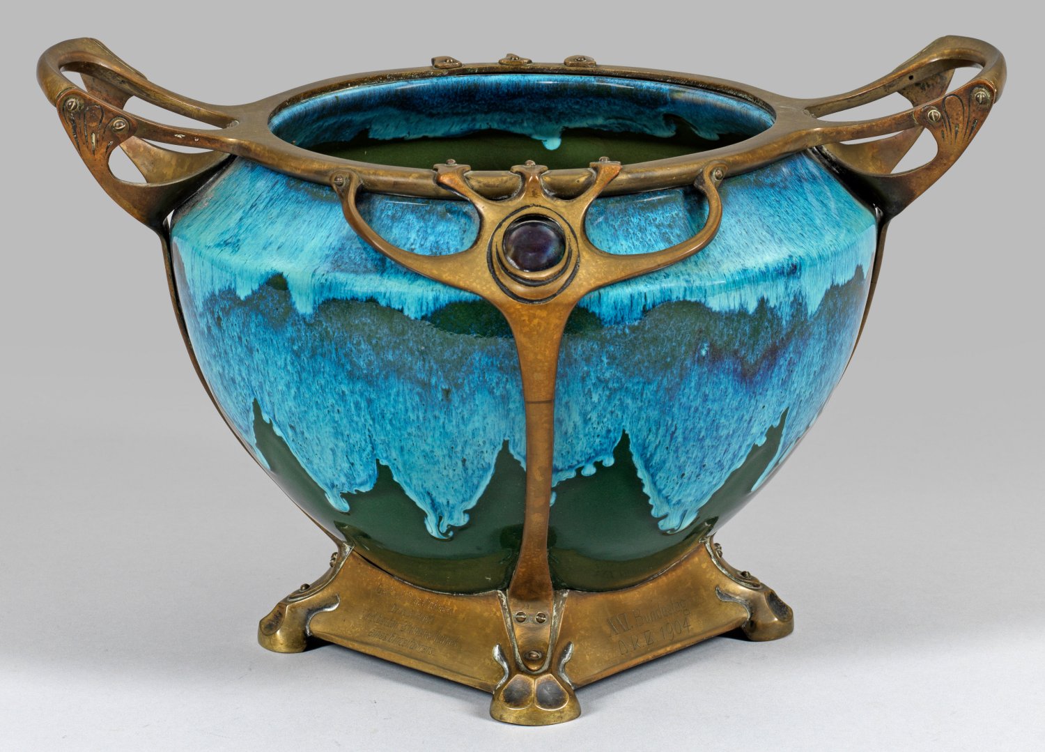 Wohl Steinzeug, hellblaue Laufglasur auf dunkelgrünem Grund. Breite, ovoide Form, diagonale Schulter, weite Öffnung. Montierung mit quadratischem Fuß. An den Ecken vier stilisierte, hochgezogene Streben, die in zwei gebogte Griffe bzw. in durchbrochene Pfauenaugenmotive mit der Glasur entsprechenden Opalglascabochons enden. Undeutl. Pressmarke unter der Glasur; die Montierung mit gravierter Inschrift "Gestiftet von den Einzelfahrern Düsseldorf's (/) Für den besten Blumenschmuck eines Einzelfahrers. (/) XXI. Bundestag D.R. B. (=Deutscher Radfahrer-Bund) 1904". H. 22,7 cm.