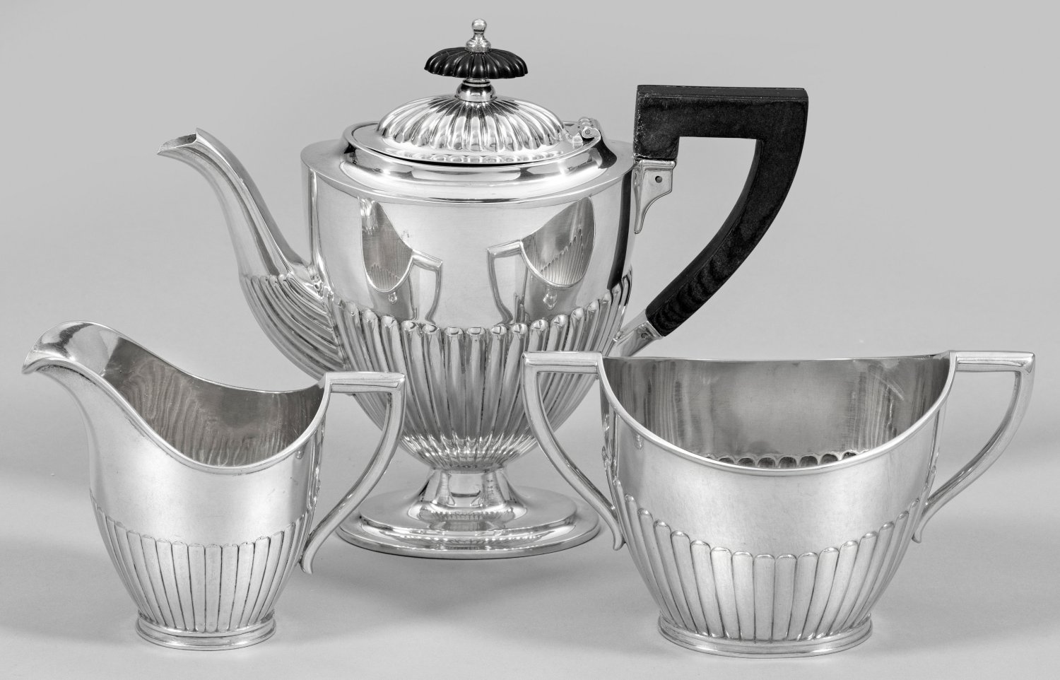 Sterlingsilber, Silber. 3-tlg.; Mokkakanne, Sahnegießer und Zuckerschale. Über ovalem Stand sich erweiternder, in der unteren Wandungshälfte von Godronen umzogener Korpus mit abgesetzter Schulter und scharniertem Deckel. Korrespondierend gestalteter, ebonisierter Knauf und gekanteter Henkel. Teilw. innen vergoldet. Gest. u.a. 800 sowie Beschaumarken, Herstellerzeichen und Jahresbuchstabe "W". Gew. zus. ca. 705 g. H. 9 cm - 17 cm.
