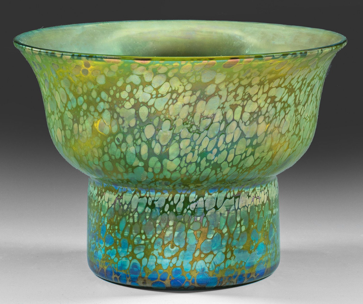 Tiefe Schale, unterhalb zylindrisch, oberhalb glockenförmig bzw. s-förmig ausschwingend. Form-Entw. Carl Witzmann, 1913, im Auftrag des Österreichischen Museums für Kunst und Industrie oder des Österreichischen Werkbunds, Wien. Glas mit Dekor "creta Papillon". Grünes Glas mit aufgeschmolzenen Silbergelbkröseln, reduziert und irisiert. H. 16,5 cm; D. 23,3 cm.
