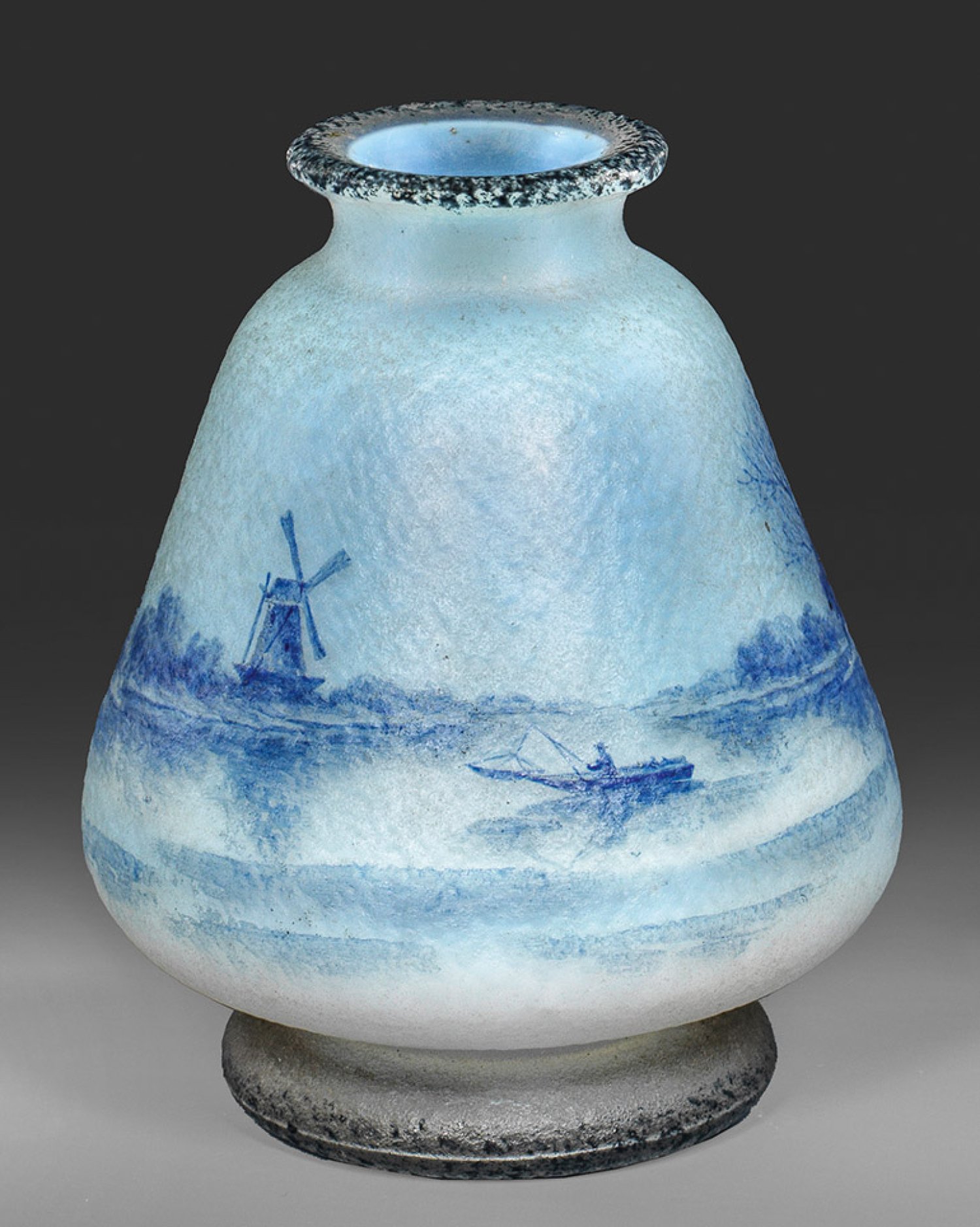 Beutelform. Auf ausgestelltem, kleinem Fuß konischer, zum Stand und zur Schulter gerundeter Korpus, kurzer, verengter Hals mit auslippendem Rand. Farbloses Glas, hellblau-opalisierend unterfangen. Geätzter Dekor in Kombinationen mit blauer Emailmalerei aus einer holländischen Flusslandschaft mit Windmühle und Fischer, Fuß und Lippenrand schwarz staffiert. Sign. "Daum Nancy" mit Lothringer Kreuz in Gold. H. 10 cm.