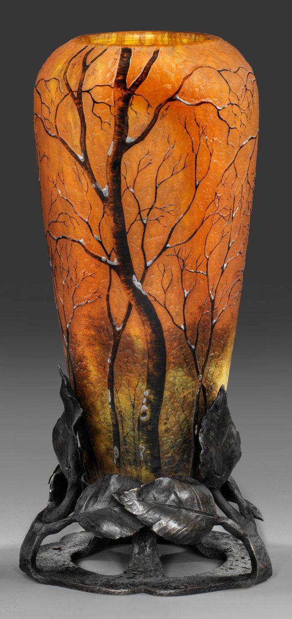 Schlanke Kolbenform mit gerundeter Schulter und eingezogener Mündung. Überfangglas, farblos bzw. mit gelben und orangefarbenen Pulvereinschmelzungen. Der Dekor mit verschneitem Birkenwald, geätzt und kombiniert mit Emailmalerei. Dreipassige, durchbrochen gearbeitete, schmiedeeiserne Montierung mit drei jeweils dreiblättrigen Birkenzweigen gestaltet, den Vasenkorpus tragend, sign. "DAUM". Ges.-H. 17,5 cm.