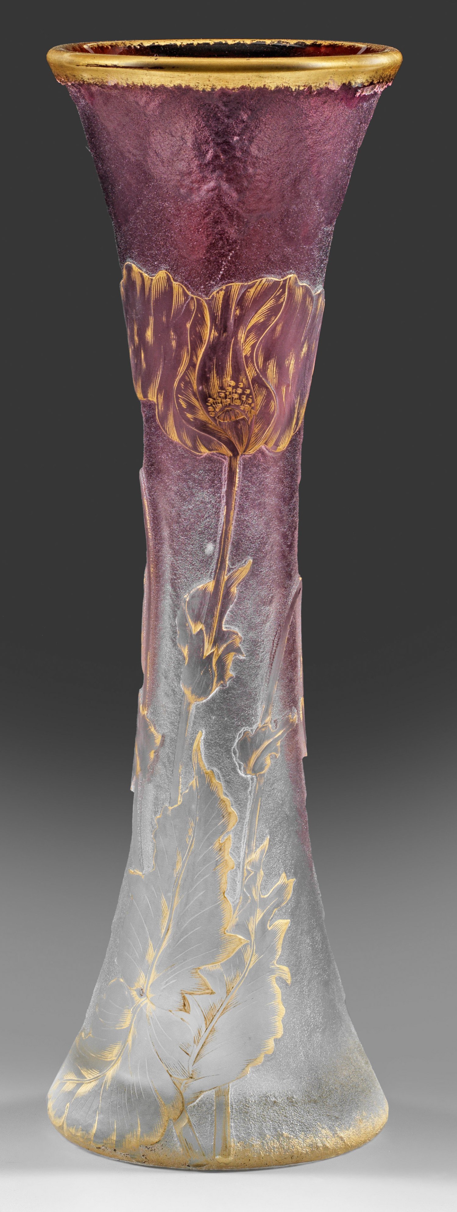 Schlanke, mittig konkav einschwingende Stangenform. Farbloses, nach oben hin violett verlaufendes Glas. Dekor aus blühendem Mohn, einem Schmetterling und Blattranken, geätzt und in Kombination mit Goldmalerei, eisglasartig rauer Grund. Minim. Herstellungsfehler. Sign. "Daum Nancy" mit Lothringer Kreuz in Gold. H. 34,2 cm.