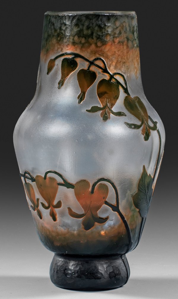 Auf abgesetztem, kleinem, konischem, massivem Fuß sich konisch erweiternder Korpus, in die gerundete Schulter und den sich leicht verjüngenden Hals einschwingend. Überfangglas, farblos, rot und dunkelgrün. In mehreren Arbeitsgängen geätzter Dekor, Motiv mit Tränenden Herzen (Lamprocapnos spectabilis), der Grund partiell flächig im Martelé-Schliff überarbeitet. Sign. "DAUM NANCY", Lothringer Kreuz (gravierter Schriftzug, goldberieben). H. 20 cm.