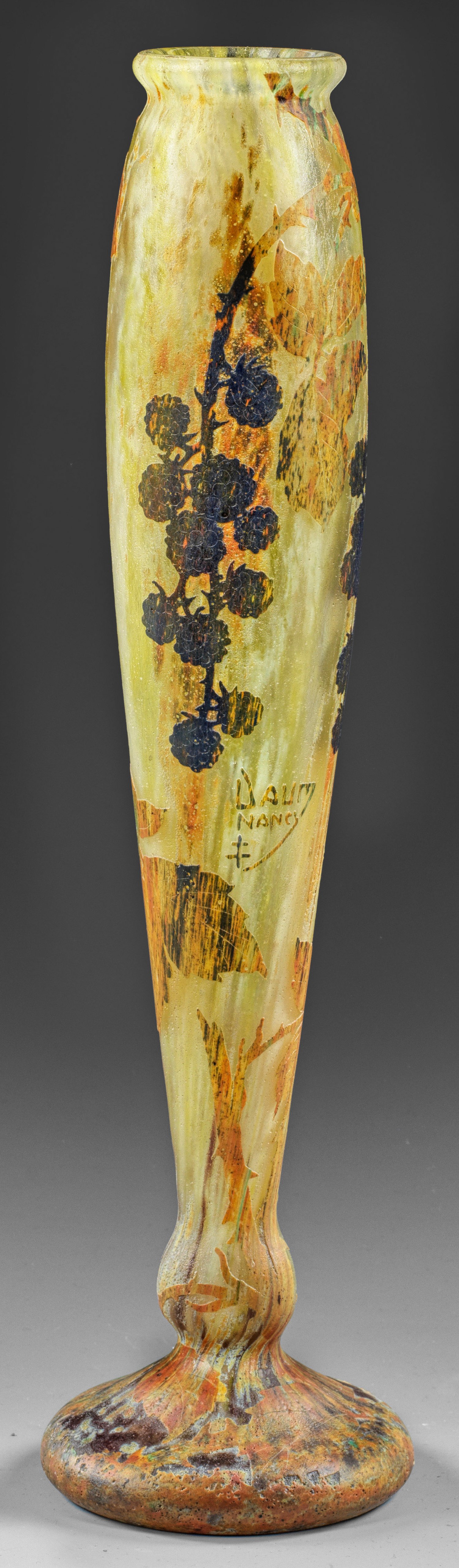 Schlanke Keulenform auf ausgestelltem Fuß. Überfangglas, farblos sowie mit polychromem, ein- und aufgeschmolzenem Pulver. Umlaufender, geätzter Dekor aus Brombeerzweigen mit Früchten und sich herbstlich verfärbendem Blattwerk. Eisglasartig rauer Grund. Sign. "DAUM NANCY", verbunden mit lothr. Kreuz. H. 38,5 cm.