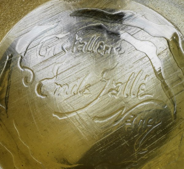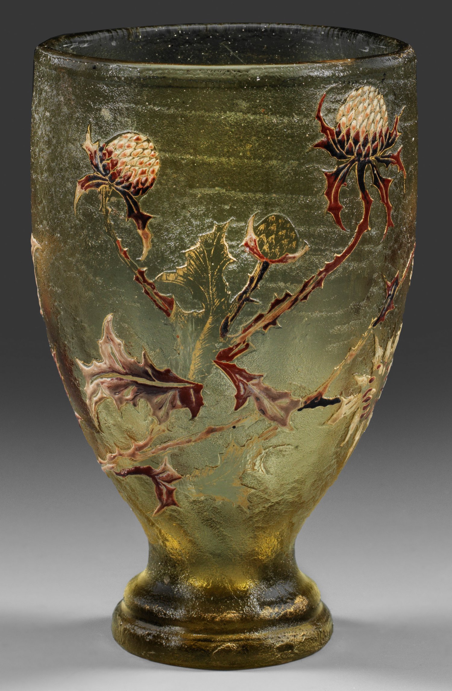 Ins Oval gedrückte Form auf profiliertem Fuß. Dickwandiges, rauchfarbenes Glas, geätzter sowie in Email- und Goldmalerei ausgeführter Dekor vor eisglasartigem Grund. Am Boden in einer Distelblüte sign. "Gallé deposé". H. 16,2 cm.