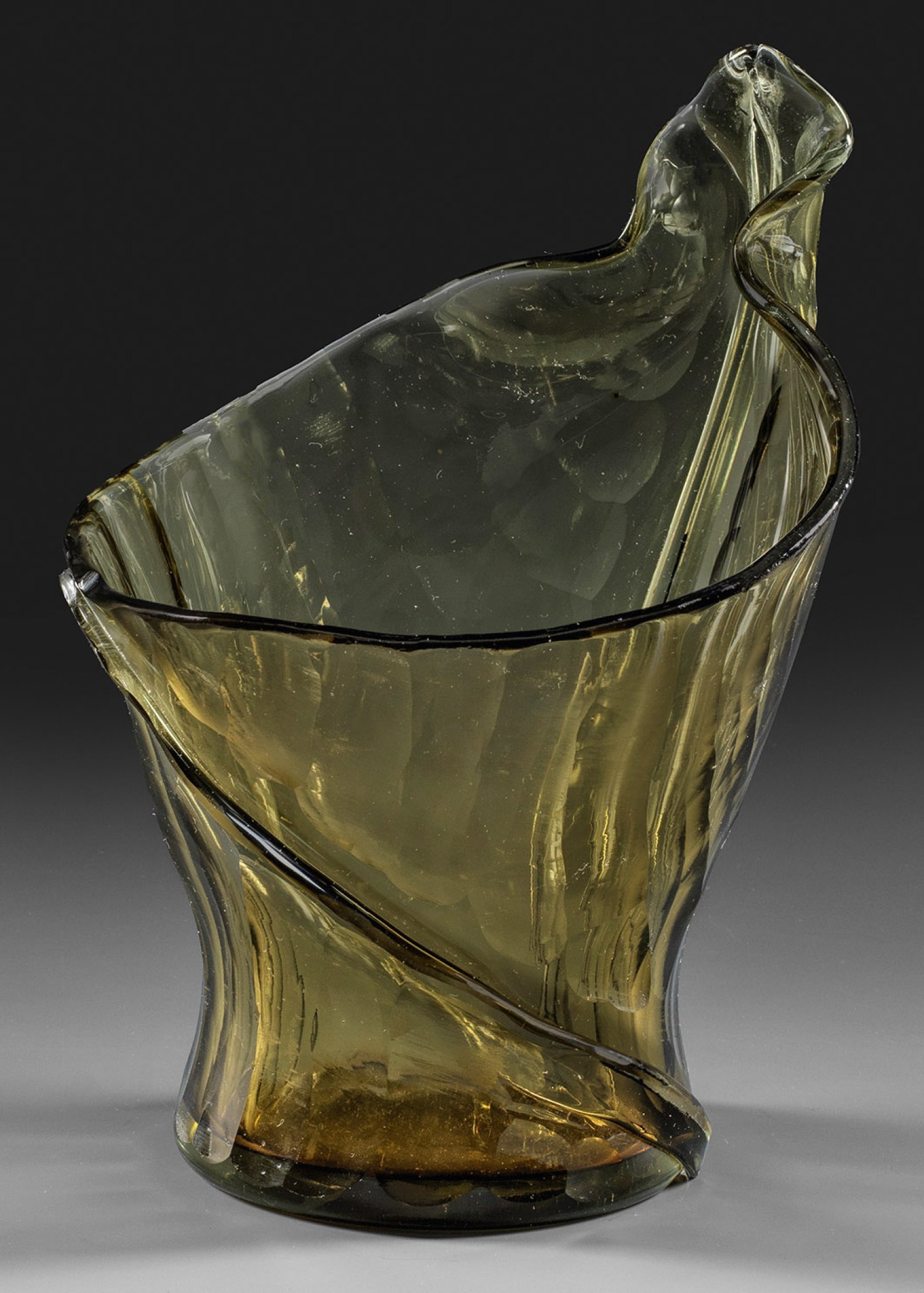 Asymmetrische Form in Gestalt eines eingerollten Salomonssiegel-Blattes. Rauchfarbenes, modelgeblasenes Glas mit frei angefügten Applikationen, mehrfach gekniffen, durch Schliff entsprechend der Struktur des Blattes reliefiert, poliert. Entw. Emile Gallé, 1888. Sign. "Cristallerie Emile Gallé Nancy" in gewellter, blütenartiger Rahmung. H. 21,5 cm.