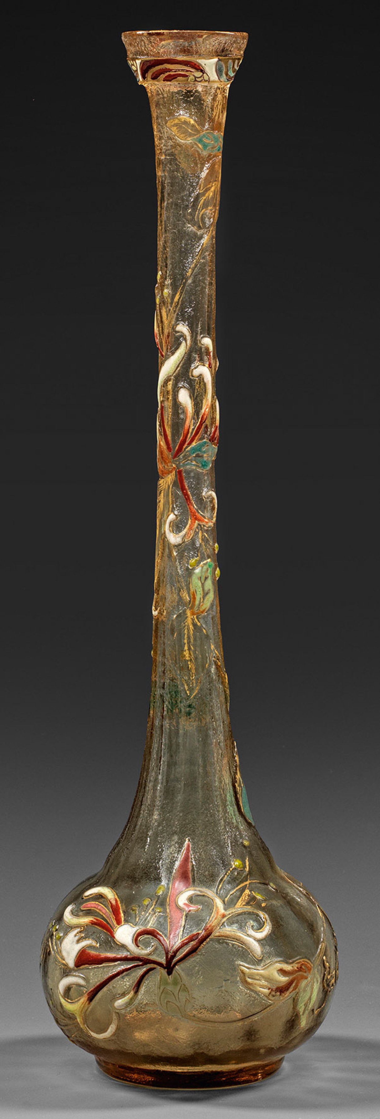 Soliflore-Vase mit kleinem, kugeligem Kopus, langem Enghals und Trompetenmündung. Längsoptisch geblasenes, rauchfarbenes Glas. Dekor geätzt in Kombination mit polychromer Email- und Goldmalerei aus blühenden Geißblatt- bzw. Jelängerjelieber-Ranken und korrespondierender Inschrift "Lien d'amour" (Band der Liebe). Sign. Gallé. H. 32 cm.