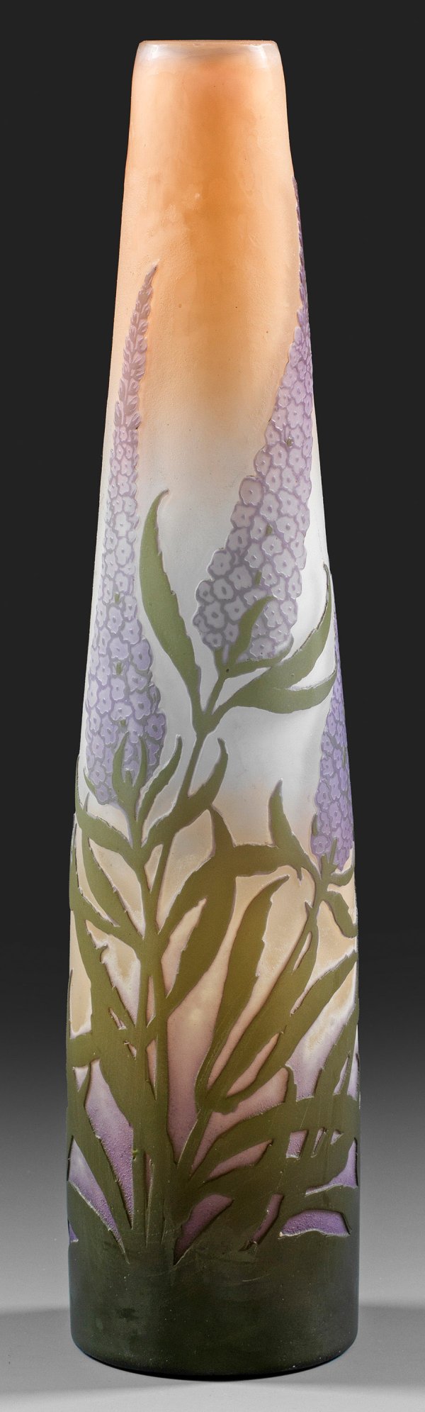 Hohe, schlanke, sich konisch verjüngende Kolbenform. Überfangglas, farblos, roséfarben, weiß, blauviolett und grün. In mehreren Arbeitsgängen ausgeführter, geätzter und teilw. polierter Dekor aus blühenden Ehrenpreisstengeln (Veronica spicata). Sign. Gallé. H. 37,5 cm.