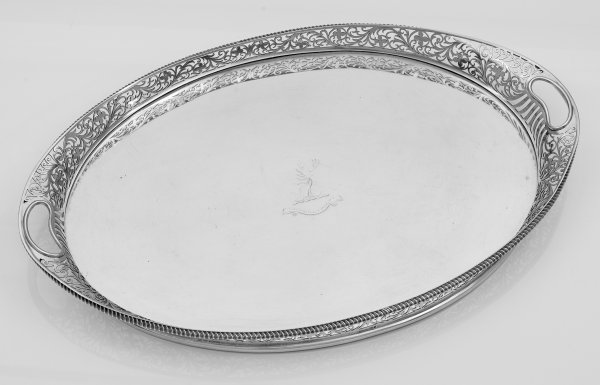 Sterlingsilber. Ovale Form. Glatter Spiegel, übergehend in floral durchbrochen gearbeitete, aufgestellte Fahne mit seitlichen Durchbrüchen als Handhaben und mit Zungenfries umzogenem Rand. Im Spiegel das Wappen der irischen Barone Farnham mit graviertem Hirschkopf über Spruchband "Je suis pret". Gest., Beschauzeichen, Herstellerzeichen, Jahresbuchstabe "i". Gew. ca. 2640 g. H. 4,5 cm. 57,5 cm x 38 cm.