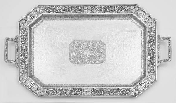 Silber. Achtfach gekantete Form, übergehend in gerade, breite Fahne. Spiegel flächendeckend mit feinem Hammerschlagdekor verziert. Mittig ein korrespondierend achteckiges, graviertes Medaillon mit zentralem Schriftzeichen, umgeben von Wolkendarstellungen und zwei fliegenden Drachen, gerahmt von Mäanderband. Die Fahne umlaufend und alternierend verziert mit reliefplastischen Kampfszenen und Medaillons mit Schriftzeichen. Seitlich zwei gekantete Handhaben mit Bambusblättern und Blüten dekoriert. Gest., Beschauzeichen, Meister wohl Tu Mao Xing (tätig ab ca. 1880). Gew. ca. 3340 g. 71 cm x 42 cm.