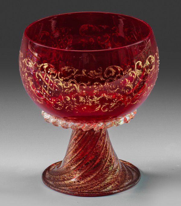 A Murano ruby glass goblet with gold and enamel decor and gold foil inclusions.