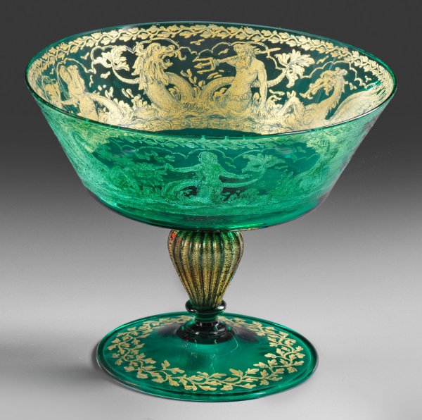 Grünes Glas. Tellerfuß mit umgeschlagenem Rand, gerippter Balusterschaft mit Goldfolienaufschmelzungen, abgesetzte Kuppa. Radierter Golddekor mit einem Fries aus Neptun, Nixen, Delfin und Meerwesen, am Lippenrand und auf dem Fuß eine Rankenbordüre. Sign. "Gino Cenedese". H. 14,8 cm; D. 18 cm.
