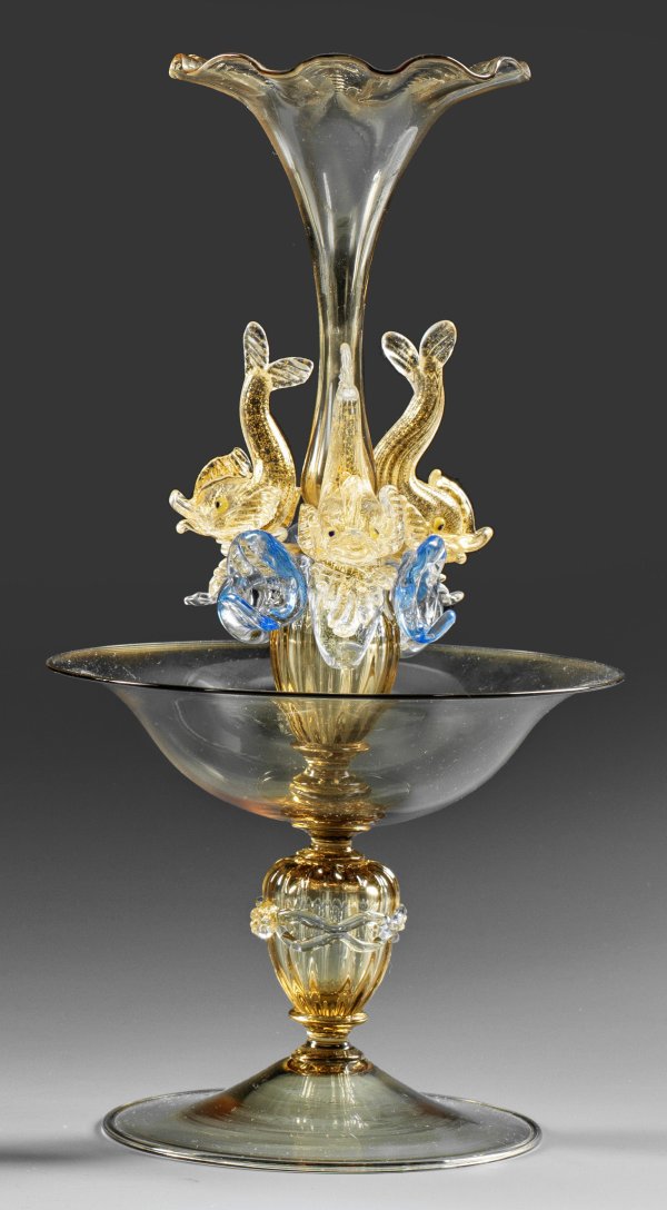 Rauchfarbenes, farbloses und hellblaues Glas, teilw. gerippt, gekniffen und mit Einschmelzungen aus fein zersprengter Goldfolie. Auf weitem Fuß reich gegliederte Form mit glockenförmiger Schale, drei stilisierten Delfinen und Ziervase. H. 30 cm.