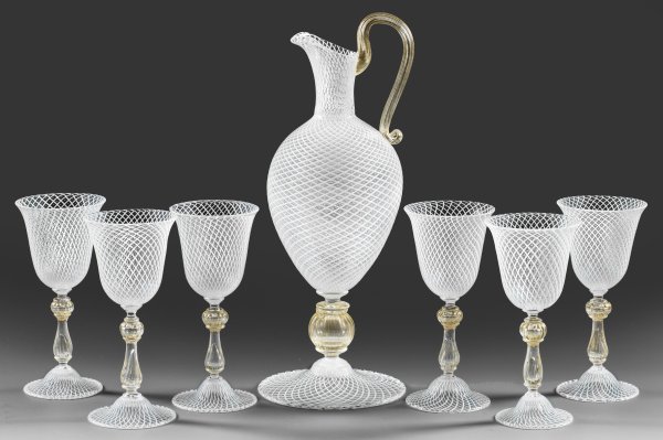 Lot 467: Schenkkanne und sechs Weinpokale mit Reticello-Dekor