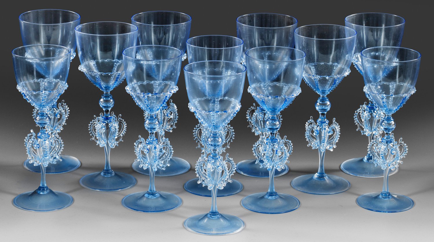 Twelve Murano light blue wine glass goblets.