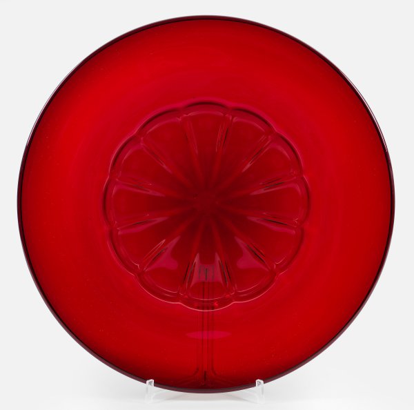 Flache Tellerform, kleiner, vertiefter, rosettenartig gerippter Spiegel, breite Fahne mit umgeschlagenem Rand. Dünnwandiges, rubinrotes Glas. Entw. Vittorio Zecchin, 1925. D. 49,5 cm.
